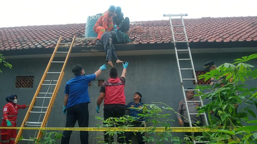 Petugas mengevakuasi jasad kakek penjaga kontrakan yang ditemukan di dalam toren air di Singaparna, Tasikmalaya. (KOPAL.ID)